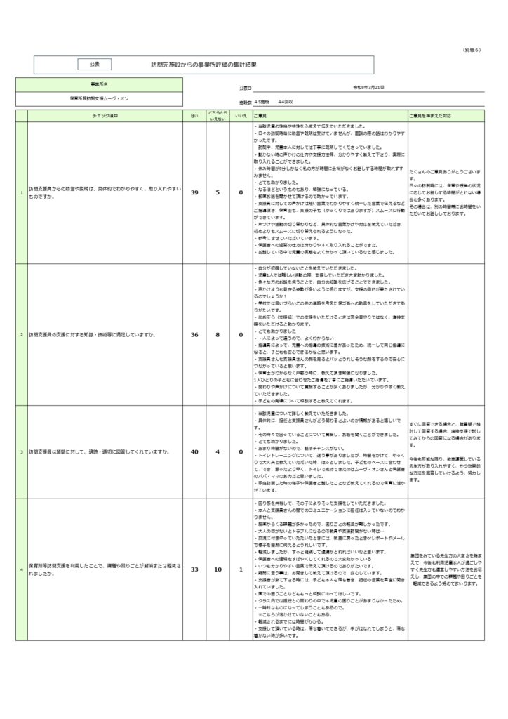 お知らせ 保育所等訪問支援 2歳児から対応可能になりました 関連記事 保育所等訪問支援 2歳児から対応可能になりました 2025年4月6日 令和6年度 事業所アンケートを公開します 2025年4月6日 保育所等訪問支援 年少さんも受付開始しました 2023年10月17日 相談支援を令和5年4月1日より開始しました 2023年5月4日 保育所等訪問支援「ムーヴ・オン」を開所致しました 2022年8月8日
